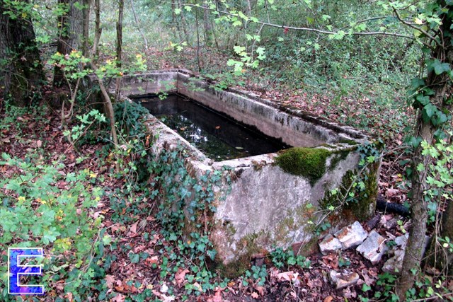 Photo E: Alors que tout autour, il y a des blockhaus de la Seconde Guerre Mondiale, nous nous trouvons ici à l'emplacement du camp 1C du Hardwald-Lager 1 de la Première Guerre Mondiale, prévu pour 103 officiers, 2850 hommes de troupes et 315 chevaux. À proximité de l'auge se trouve le puits qui alimentait ce camp en eau.