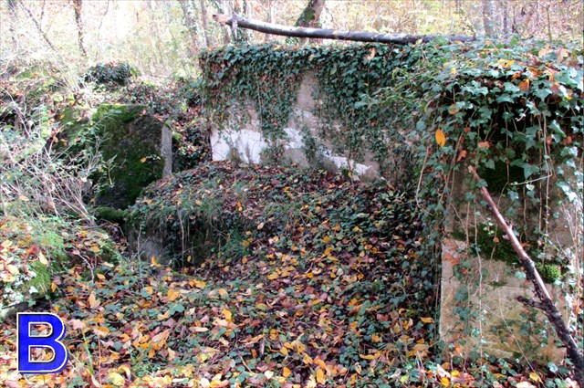 Photo B: Blockhaus pour canon anti-char, non couvert. Le blockhaus est composé de deux niveaux dont l'un, abri de 5 m x 2.5 m pour une hauteur de 2.5 m est en sous-sol. L'accès à ce niveau se fait par deux entrées, l'une au nord par un escalier d'une dizaine de marches, l'autre, au sud par quatre marches puis par un puits de 1 m x 1 m doté de deux barreaux d'échelle. L'abri est recouvert d'une dalle de béton de 30 cm. La partie en surface est composée de deux murs. La partie centrale du premier servant de créneau de tir. Le second mur protège la partie centrale.