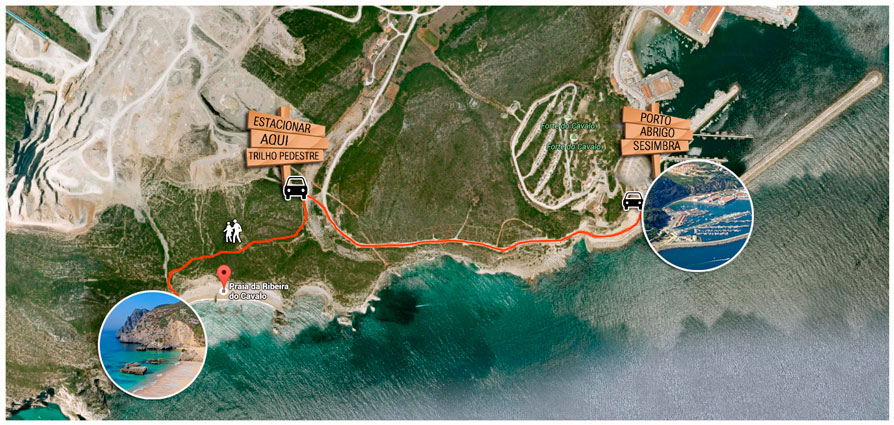 Dependendo do ponto de partida, o melhor é escolher a via mais rápida para chegar até Sesimbra. Uma vez lá procurar o Clube Naval que fica junto ao pontão. À direita do pontão há um caminho de terra batida, é por aí que deve seguir até chegar a um corte interrompido por umas pedras gigantes que se encontram alinhadas a cortar o caminho. A partir daí já não vai poder circular de quatro rodas. Estacione o seu carro e siga o trilho. Sapatilhas e mochila serão certamente o melhor equipamento para esta aventura.