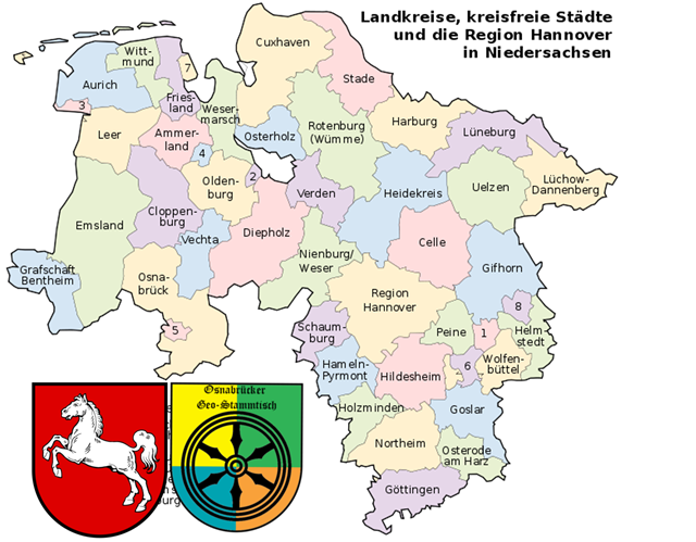 Niedersachsen ist ein Flächenland und steht mit rund 47.600 km² unter den 16 deutschen Ländern auf dem zweiten Platz hinter Bayern und nimmt bei einer Einwohnerzahl von rund 7,9 Millionen Platz vier ein. Das heutige Land Niedersachsen entstand nach dem Zweiten Weltkrieg durch die Vereinigung des Landes Hannover mit den Freistaaten Braunschweig, Oldenburg und Schaumburg-Lippe.