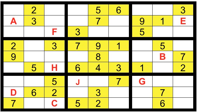 elke verticale kolom en in elk van de negen blokjes de cijfers 1 tot en met 9 één keer voorkomen. In een aantal vakjes zijn de cijfers al ingevuld.