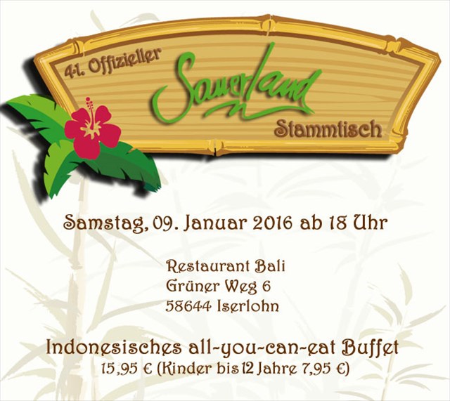 Wir freuen uns euch am 09. Januar 2016 zum 41.offiziellen Sauerlandstammtisch im Bali begrüßen zu dürfen.