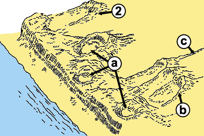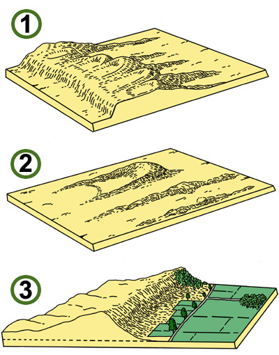So a “blown out” sand hollow - a so called “ring-dune” (a) – turns into a “parabolic dune” (2), a very typical dune form in the field of the “young dunes”. This form has a leeward slope and is curved convex, whereby the opening of the dune shows toward the wind and looks like a horseshoe. The arms of the dunes are stabilized by vegetation, while the head is displaced by windy drifts. When several of these parabolic dunes get connected, they form a “kamduin” (b), which is then exposed to the wind again. Over time, the “head” of the dune can be removed by the drift of strong winds, leaving only a remaining stripe. Suiting the appearance this dune form is called “stripe dune” (c). The entire area of the "young dunes" is exposed to a continuous development and so the dunes shift further inland and grow further. At the edge of the secondary dune landscape you (usually) find an elongated row of “kamduin”, which characterize the end of the dune landscape. This typical final compound of dunes is called "kamduinreeks" (3).