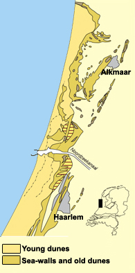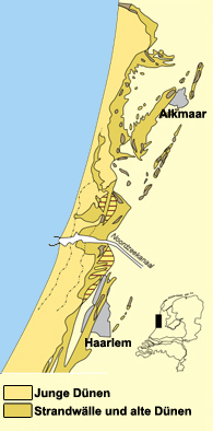 Exemplary the coordinates of this EarthCache lead the visitor in exactly such a very young and "dynamic" dune landscape in the south of Egmond aan Zee - between Alkmaar in the north and Haarlem to the south (see figure at right). How this dunes developed and how they can be divided geologically, shall be explained below.