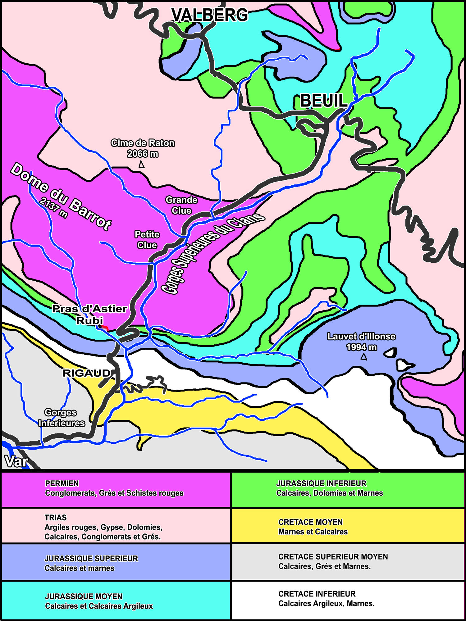 Le Var se glissant dans une faille tectonique découvrait ainsi plus de 2000m de ces cendres sédimentées. Suite au mouvement tectonique formant la chaîne des Alpes, au tertiaire, les plissements alpins soulevant le dôme du Barrot ont laissé apparaître localement des schistes rouges (pélites) datant du permien.