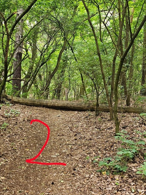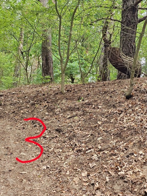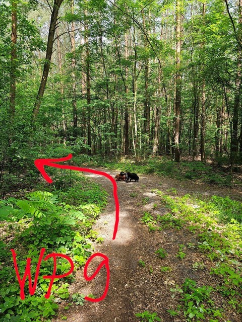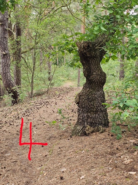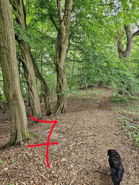 Wegpunkt 11: Du kommst wieder an ein Wege"T". Du biegst nach rechts ab. Gehe jetzt Richtung Tradi Steinpilz. Dann Richtung Tradi Echse. Nach wenigen Metern siehst Du eine Doppel-Birke. Stelle Dich auf Höhe der Birke mitten auf den Weg und peile 1,169 km bei 80°