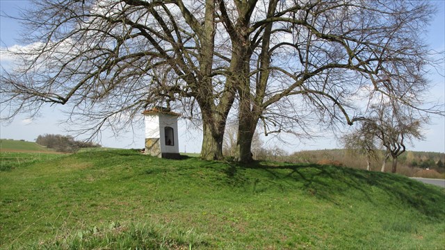 Výklenková kaplička na vrcholu kopce. Počet osob na hlavním obrázku na zadní stěně výklenku = G