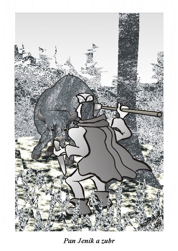 Šel ještě asi hodinu, překročiv další údolí, jež sluje dnes Vohančické. Tu se ozvalo zafunění, zapraskání v houští a proti lovci stál mohutný zubr, netváře se vůbec přívětivě. Chvíli si prohlížel nezvaného vetřelce, pak sklonil hlavu... To už ale Jeník nečekal. Mohutně se rozmáchl kopím a vší silou jej vrazil nakvašenému zvířeti do boku. To se vzepjalo v smrtelné křeči, útočník však hbitě tasil mečík, jimž byl opásán, a ukrátil jím život raněného zvířete.