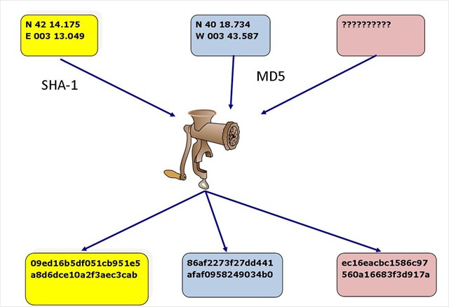 Para un conjunto de datos de cualquier tamaño la función hash siempre nos devolverá un conjunto de datos de longitud fija. Por ejemplo, si obtenemos el hash SHA-1 de N 42 14.175 E 003 13.049 nos dará como resultado: