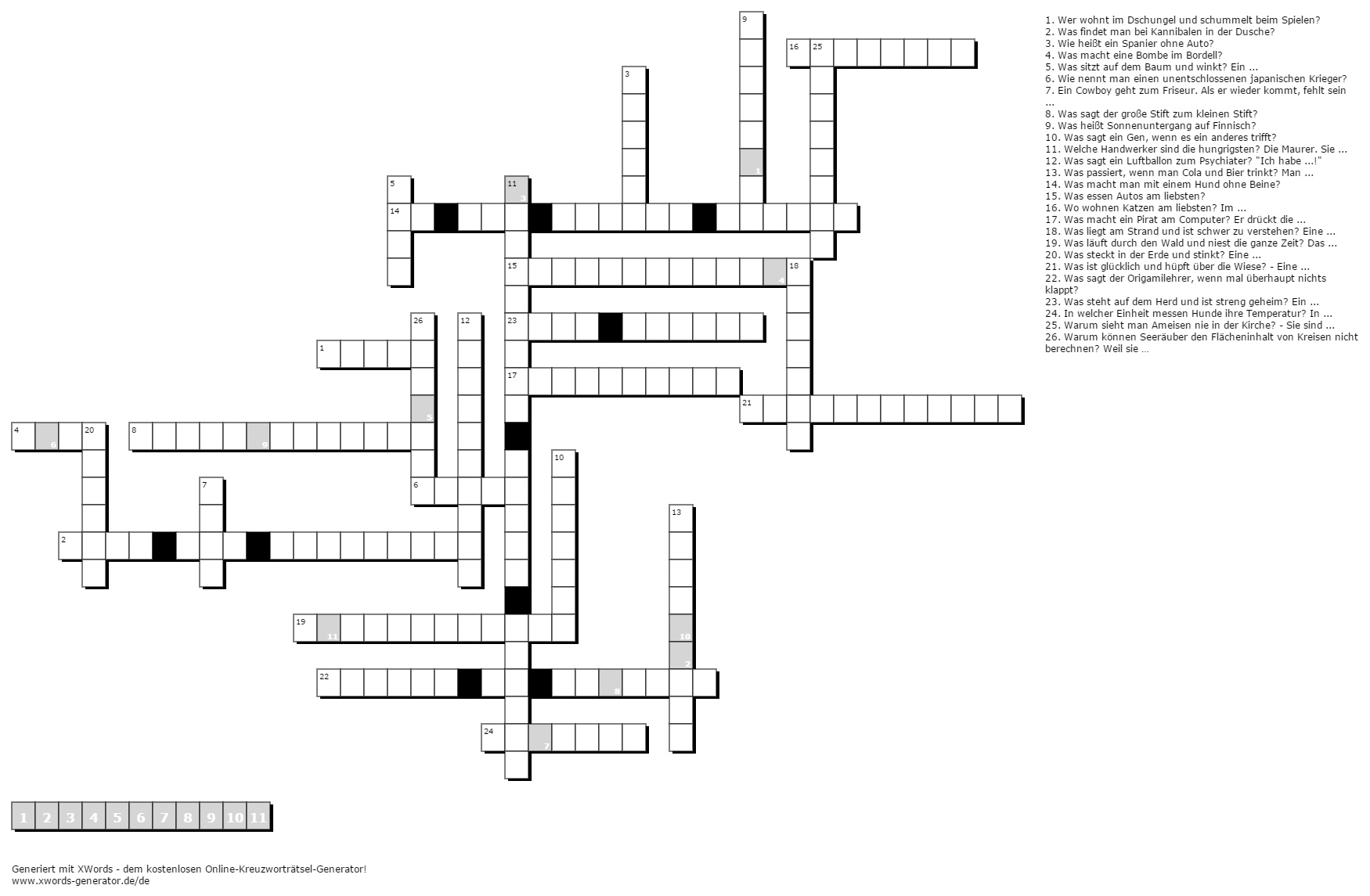 Bei diesem Mystery soll es darum gehen, das folgende Kreuzworträtsel zu lesen. Zum Teil sind die Antworten ganz einfach, zum Teil muss man ein wenig um die Ecke denken. Auf jeden Fall darf man mal ein wenig schmunzeln, oder schlicht über die abgrundtiefe Grottigkeit schmunzeln, die der Humor mancher Leute zutage fördert. Meist lacht man dann mehr über die freudige Erwartung, die einen aus dem Gesicht des Witzerzählers entgegenstrahlt. inkedvegan kann da ein Lied von singen - sie war das bemitleidenswerte Versuchsobjekt