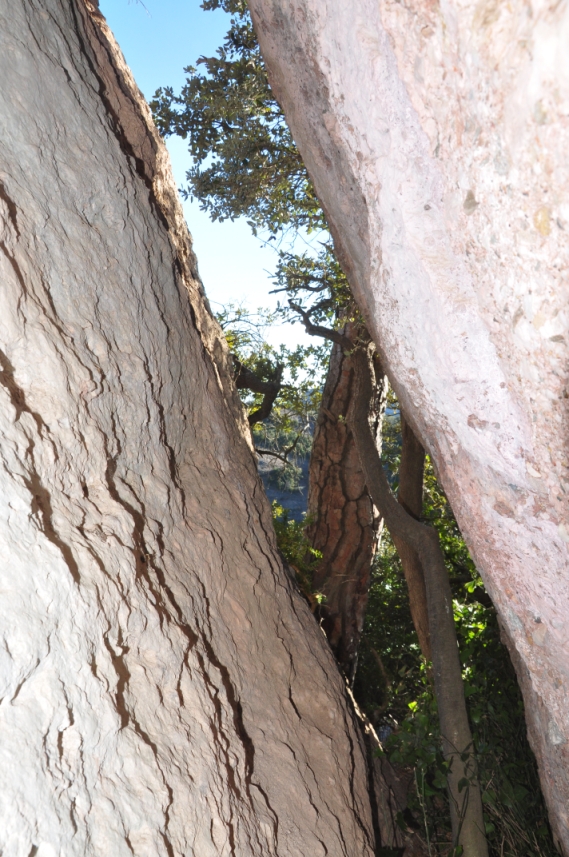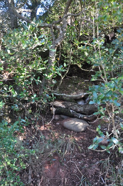 Continuem i una mica més endavant veiem una gran soca d'alzina amb moltes branques situada just davant de la canal de pujada a la Cova de la Cabrafiga WP7.