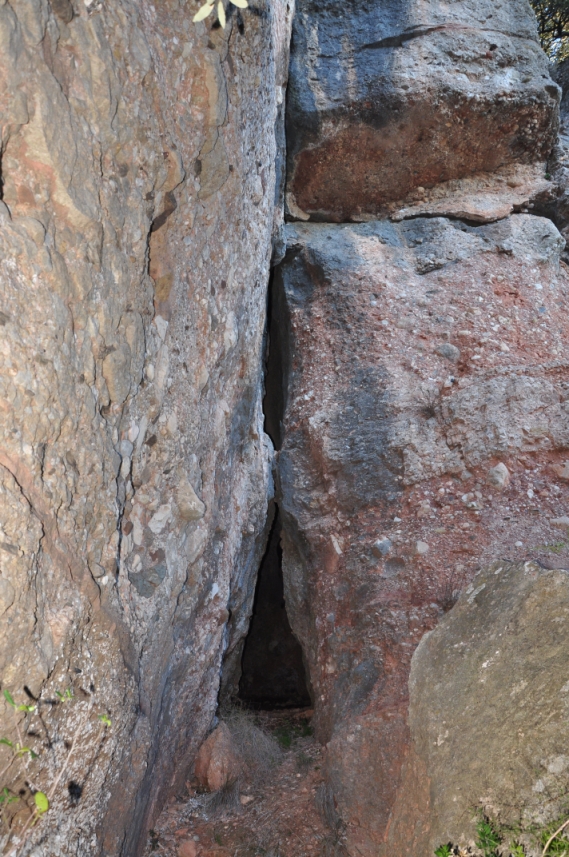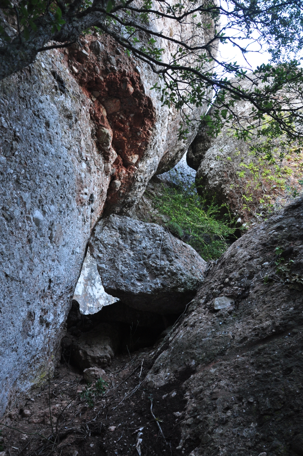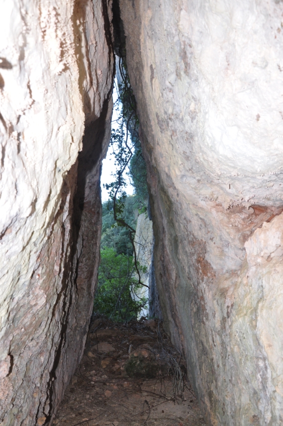 Seguim la recerca passant entre un gran arboç i la paret de roca, voregem la cinglera cap a la dreta fins a trobar la canal per pujar a la Cova de l'Ensorrament WP6.
