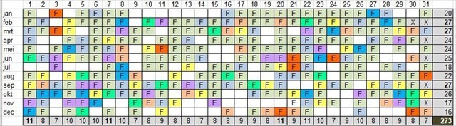 On January 17th, 2019 the cache was exactly three years active. The calendar with the days on which the cache was found (F) looked like this. Additional days in yellow. Still 169 days to go ...