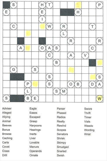 As described by Puzzle Baron's website: "A reverse word search puzzle is pretty much exactly what it sounds like - basically a regular word search puzzle, but solved in reverse! You're given a list of words and a mostly empty grid. A small number of letters are pre-placed on the grid to indicate the starting letter of each word in the list. Your task is to place each word into the grid (horizontally, vertically or diagonally in either direction) in such a way so that every word is placed once, every starting letter is used at least once, and every square on the grid is filled. Each puzzle has only one unique solution, and each solution can be reached using pure logic (guessing and trial and error are never required!)."