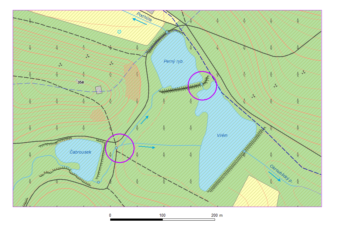 V případě oblasti Kochánovických rybníků se potok procházející rybníkem Čabrousek dělí mezi Okrouhlický potok a Podhůru (opravdu jde také o potok, nejen o oblíbené rekreační lesy kolem vrchu Hůra). Kliknutím si můžete mapu zvětšit.