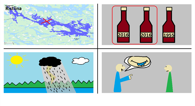 Tehtävänä on keksiä kuva-arvoituksiin kätkeytyvät sanamuunnokset, joista jokaisessa esiintyy numero. Näistä numeroista sitten muodostuu koordinaatit kätköpurkille. Olkaatte hyvät: