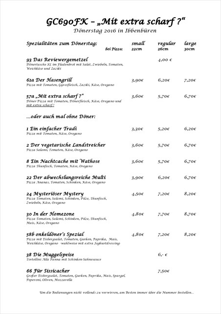 Spezialität ist hier der XXL Döner, wobei Ihr hier auch sonst ein reichhaltiges und preisgünstiges Speisen- und Getränkeangebot vorfinden werdet. Es wird auch wieder eine extra Event-Speisekarte mit speziellen Cachergerichten geben, diese werde ich hier noch ins Listing einfügen.