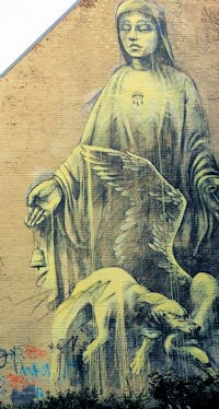 Faith47 heeft voordat ze aan een muurschildering begint, de schets in grote lijnen al klaar. Sommige elementen verwijzen naar materialen die ze op de locatie zelf aantreft. Zou de Madonna op de schildering misschien geïnspireerd kunnen zijn door het Christusbeeld op het Tempsplein?