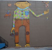 de act bestond niet alleen uit een muurschildering van de broers Pandolfo, maar ook een 1 op 1 kopie van het grote, met veel kleur getekende figuur als ballon.