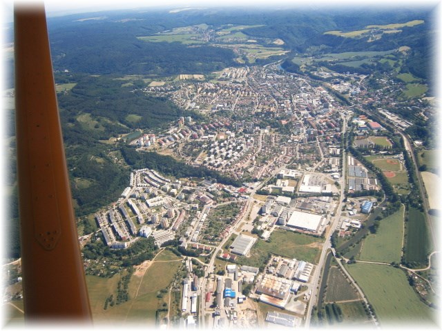 Na téhle fotografii je Blansko a tam někde dole ve městě stojí kříž. Vaším prvním úkolem bude tento kříž najít.