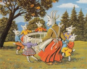 Geißenmutter muss das Haus verlassen und gibt ihren sieben Geißlein auf, während ihrer Abwesenheit niemanden ins Haus zu lassen. Kurz nachdem sie gegangen ist, kommt bereits der böse Wolf vorbei und begehrt Einlass.