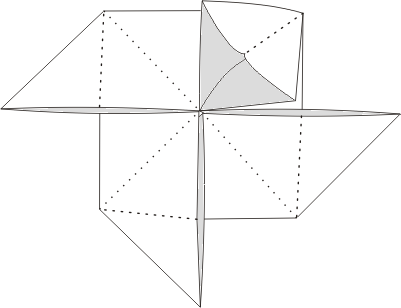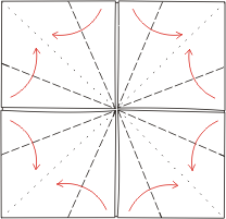 Jeśli zagięcia zostały wykonane poprawnie otrzymamy taki kwadrat jak na rysunku, składający się z czterech mniejszych kwadracików. Ich boki zaginamy tak jak na rysunku. Powstają nam cztery formy wyglądające jak lody w rożku.