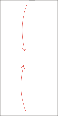 Zginamy kartkę na pół. Linia pierwszego gięcia to pionowa linia, łącząca środki górnego i dolnego brzegu. Rozkładamy ją i powtarzamy zgięcie na pół, ale tym razem poziomo. Znów rozkładamy kartkę. Uzyskaliśmy dwie, przecinające się linie gięcia jak na prawym rysunku.