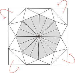 Powstały kwadrat zginamy po obu przekątnych i rozkładamy, podobnie jak robiliśmy w punkcie '4'.