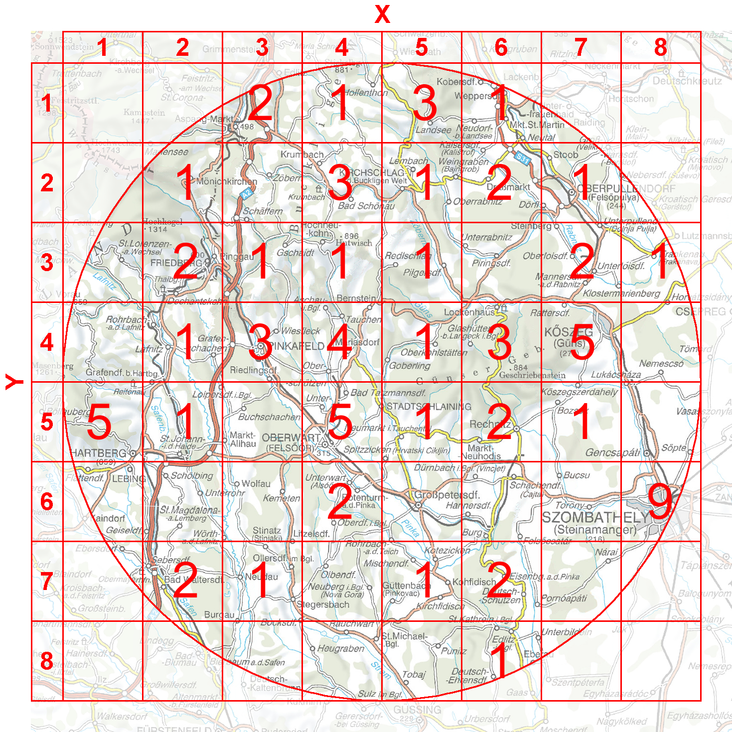 Die Grundlage bildet die Landkarte, die die Umgebung im Umkreis von 30km zeigt und auf der ein Raster aufgedruckt ist. Auf dieser müssen die Fotos zugeordnet werden, und zwar lediglich in der Genauigkeit des Rasters. Dabei ist grundsätzlich der Ort gefragt, den das Foto zeigt, und nicht der Standpunkt, von wo aus das Foto gemacht wurde. Spezielle Streitfälle sind in der jeweiligen Anmerkung des Fotos geklärt. Liegt ein Ort genau auf der Grenze zwischen zwei Zellen, ist jene Zelle zu nehmen, auf der sich die Beschriftung dieser Ortschaft befindet. Zu jedem Foto müssen also die Werte X und Y ermittelt werden. Als kleine Hilfe hierzu dient die Karte mit der Anzahl der Fotos pro Zelle, auf der zu jedem Rasterelement angegeben ist, wie viele Fotos dort zu platzieren sind.