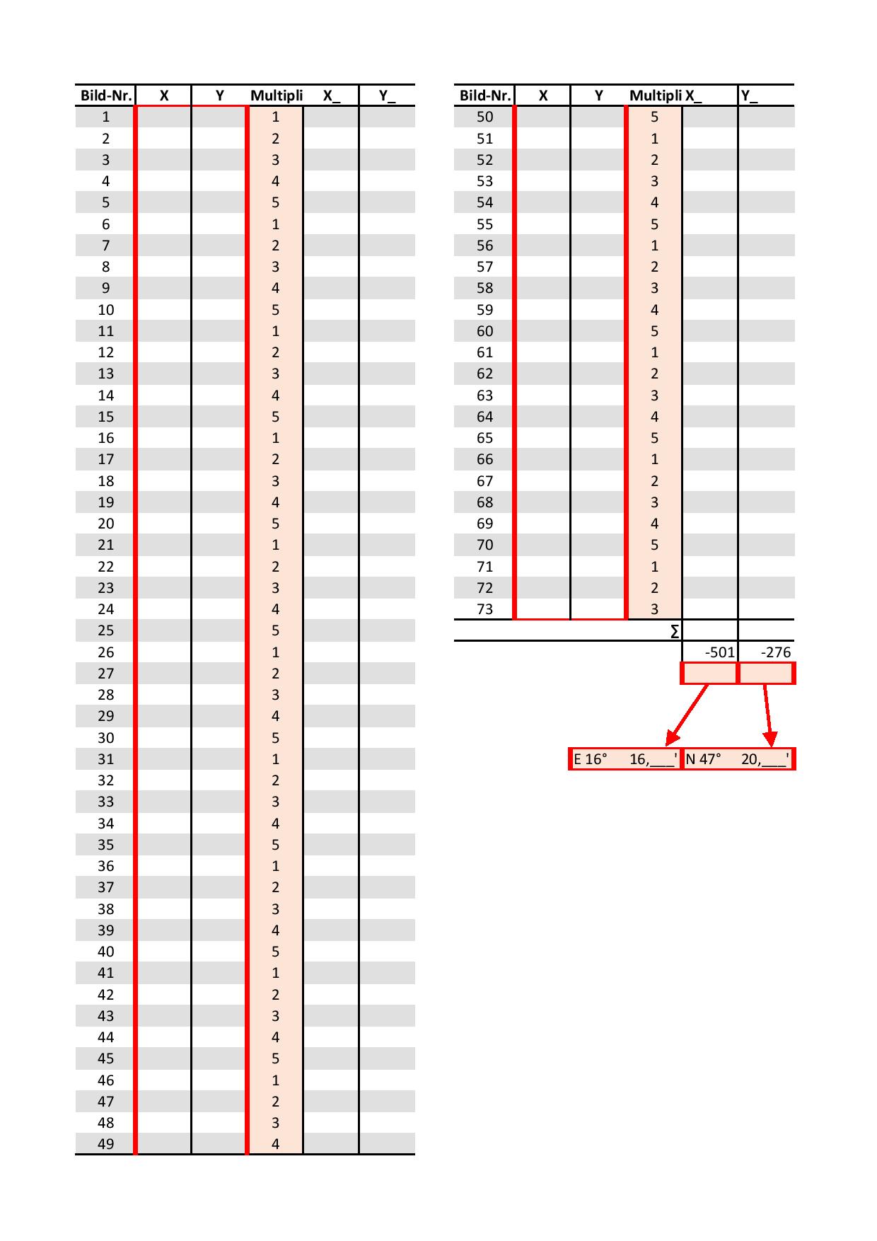 Als weitere Hilfestellung dient dieses Blatt, wo bequem zu jedem Foto die X- und Y-Werte notiert werden können. Hier sind wir dann auch schon bei der Berechnung der Koordinaten. Als ersten Schritt sind die ermittelten X- und Y-Werte mit dem entsprechenden Multiplikator zu multiplizieren (die Ergebnisse können in den Spalten X_ bzw. Y_ notiert werden). Anschließend müssen die berechneten Werte nur noch summiert und die entsprechenden Konstanten abgezogen werden, um die drei Nachkommastellen der Minutenwerte zu bekommen.