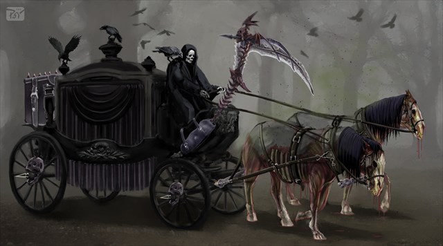 Onoho večera se Marie B. vracela cestou z Kacanov na Hrubou Skálu. Zdržela se u své známé, takže se vracela dost dlouho po západu slunce. Cestu osvětloval srpek měsíce. Nedával sice příliš světla, ale oči si na tmu brzy zvykly, takže dotyčná mohla bez váhání spěchat po tehdy kamenité cestě. Kousek před odbočkou k Žaludům zaslechla za sebou klapot kopyt a lomoz kol narážejících na nerovnosti na cestě. Trhla sebou a uskočila z cesty, protože zvuk jedoucího vozu zaslechla až na poslední chvíli. Když byl vůz na její úrovni, zavolala na vozku, zda by jí kousek nesvezl. V tu chvíli vyšel zpoza mraku srpek měsíce a jemně osvítil povoz. Náhle ji ochromil pocit nezřízené hrůzy. Ten ještě znásobil hlas vycházející z pod černé kápě čehosi, co sedělo na kozlíku vozu. "Buď ráda, že pro tebe nejedeme". Podobná slova, která slyšela Zuzánková u Radimi. Co se dělo dál už jsem se od nešťastné Marie B. nedozvěděl. Jisté je jen to, že byla nalezena po dvou dnech schoulená v kapličce u Radče a od té doby už od ní souvislou větu nikdo neslyšel.