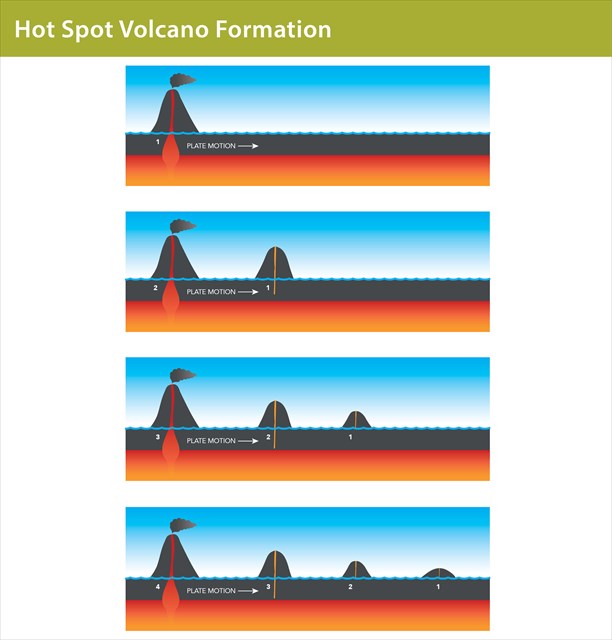 English: In geology, the places known as hotspots are volcanic regions thought to be fed by underlying mantle that is anomalously hot compared with the surrounding mantle. They may be on, near to, or far from tectonic plate boundaries. Hotspots occur when one of the Earth’s plates moves over an unusually hot part of the Earth’s mantle. These hot areas are usually relatively stationary and result in large amounts of magma rising up, piercing a hole in the plate to form a volcano. As the plates move, a series of volcanoes can form. The islands that are furthest from the hotspot are the oldest while those closest to the hotspot are the youngest (most recently formed).