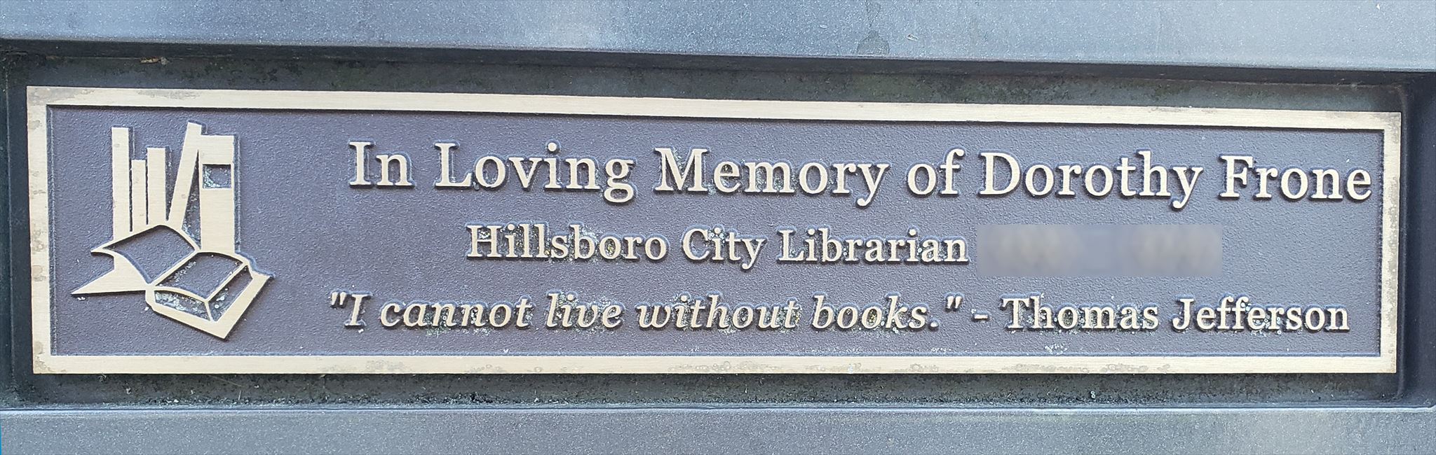 Somewhere outside the library you will find this plaque on a bench. Let the dates be XXKX-XXEX