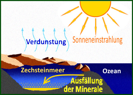Begeben wir uns nun gedanklich in der Erdgeschichte zurück. Vor etwa 258 - 251 Millionen Jahren befand sich im heutigen Mitteleuropa das flache Zechsteinmeer. Durch einsetzende Erwärmung kam es zur Verdunstung des Wassers. Die im Wasser gelösten Salze fielen dadurch aus und sammelten sich als Kristalle auf dem Grund. Darunter auch die gelösten Carbonate, wobei zuerst die Ausfällung von weniger gut löslichen Salzen stattfindet. Die hier sichtbaren späteren Dolomitgesteine entstanden entweder durch die primäre Ausfällung von Dolomit oder durch die sekundäre Dolomitisierung von Kalkschlamm.