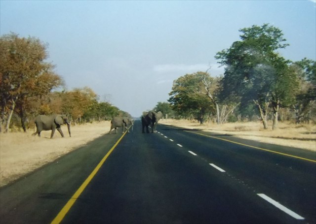 Diese Aufnahme enstand kurz vor Katima Mulilo, eine Stadt, in der die Elefanten Vorfahrt haben. Diese Stadt war der äußerste Außenposten im ehemaligen Deutsch-Südwestafrika. Wann wurde die Katima Mulilo Brücke eröffnet, die Namibia mit Sambia verbindet?