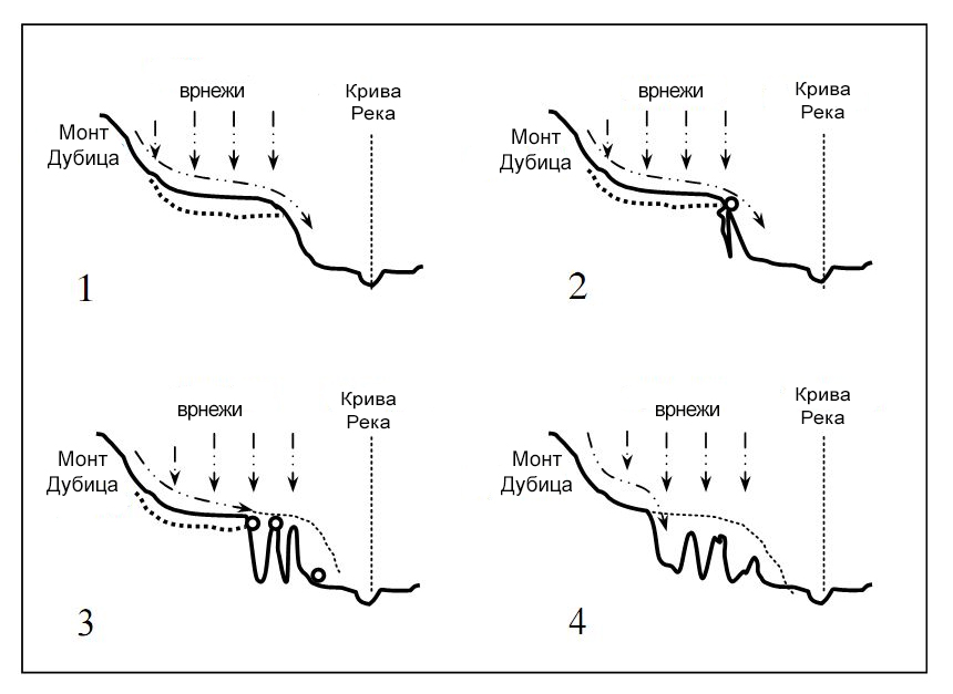 - Искачете се по степениците до видиковецот на врвот на ридот и погледнете кон планината Дубица (правец југо-запад). Ќе видите хоризонтална камена линија која изгледа прилично цврста. Над таа линија ќе видите типични структури на измиени јаруги. Дали овие камени линии навистина се масивни? Ве молиме објаснете го вашето набљудување.