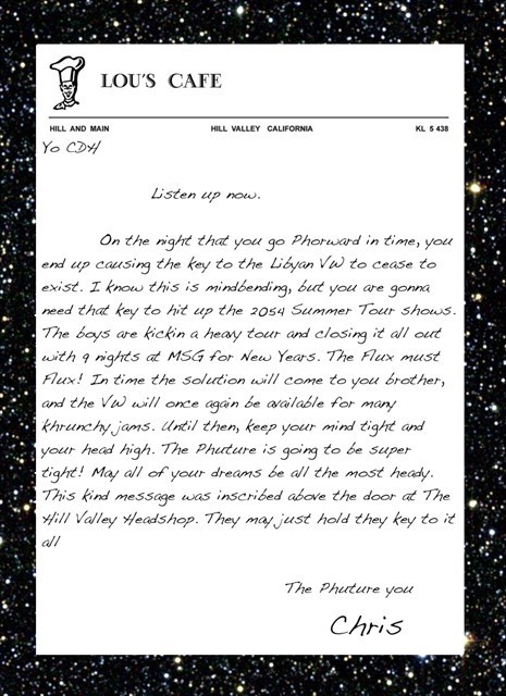 - ALL CACHES IN BACK TO THE PHUTURE CHAPTER II YOU WILL LOOK FOR THE LAST LETTERS OF SOMETHING AND THEN REFER TO THE KEY BELOW -