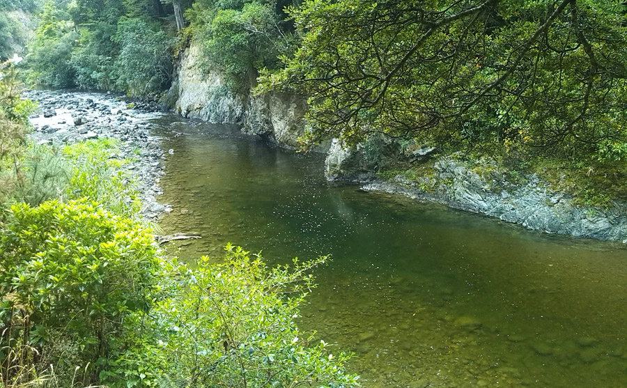 The Hutt River Walkway comes to an abrupt halt at the Whakatikei River. It continues on the other side of the river at the Whakatiki End View cache. In the summer the water flow is low enough for keen walkers or mountain bikers to wade across, but not so in winter, so a bridge spanning the river would be ideal. So far the land owners have not come to the party as a safe bridge would need to be substantial.