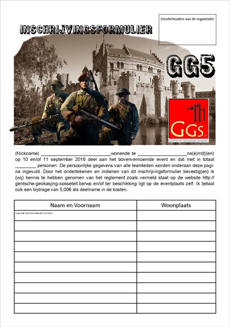 - Je kan er inschrijven voor het event zelf en je kan er onmiddellijk je officiële inschrijfformulier downloaden. Breng het ingevuld mee naar GG5 je spaart voor jezelf alweer een paar minuten uit. Voor zij die een "Will Attend" plaatsen voor 1 september houden we ook nog een kleine loterij. De GGS heeft een hele grote collectie geo-coins. Ewel, we gaan er een paar verdelen onder hen die de moeite namen om op voorhand hun aanwezigheid te melden. Je kan het inschrijfformulier hier downloaden.