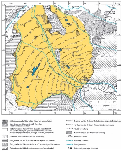 Die Mächtigkeit der Schotterschichten im Mündungsschwemmkegel der Dreisam sind beträchtlich. Abgesehen vom Rand betragen diese 50-80 m, im Bereich Rieselfeld – Haslach – Eugen-Keidel-Bad sogar über 100 m.