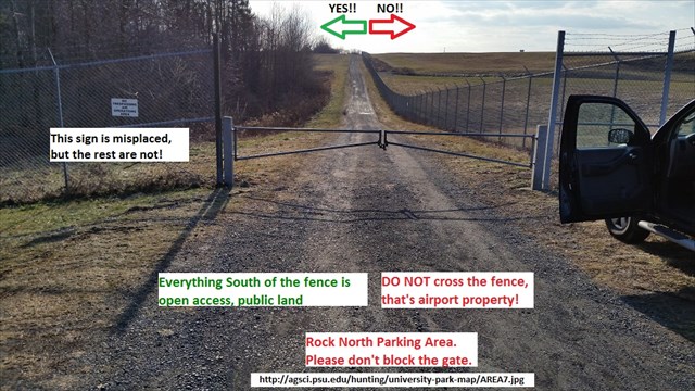 Important Stuff: This cache is located on Penn State agricultural lands that are open to the public year-round. Parking can be found at any of the three listed spots, with the easiest approach being from the Rock North location. There is place enough for 5-6 cars at this location and a well maintained gravel road that runs the perimeter of the airport that will get you half-way to the cache. There's confusing signage at this location (see my attached pic for clarification) but be assured that the cache, parking, and approach are all on public, freely accessible land. Just don't try to climb any fences and you'll be ok. Also, wear orange if you seek this during hunting season!