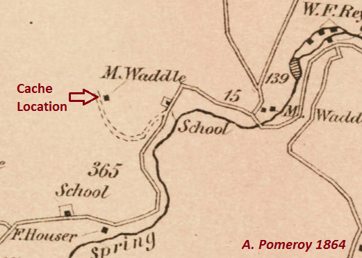 This cache is placed just above the ruins of a long collapsed farm building that dates as far back as the 1864 Pomeroy Atlas of Centre County. The original approach is long gone under farm fields and woods, but a gravel road now connects to the spot from a convenient parking spot along Rock road.