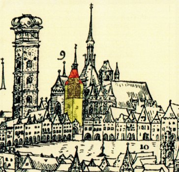 Na obou kreslených obrázcích je tato věž patrná (ano, je to ta obarvená). Původně měl kostel v průčelí věže dvě, ale druhá, bližší k Černé věži, se r. 1523 zřítila.