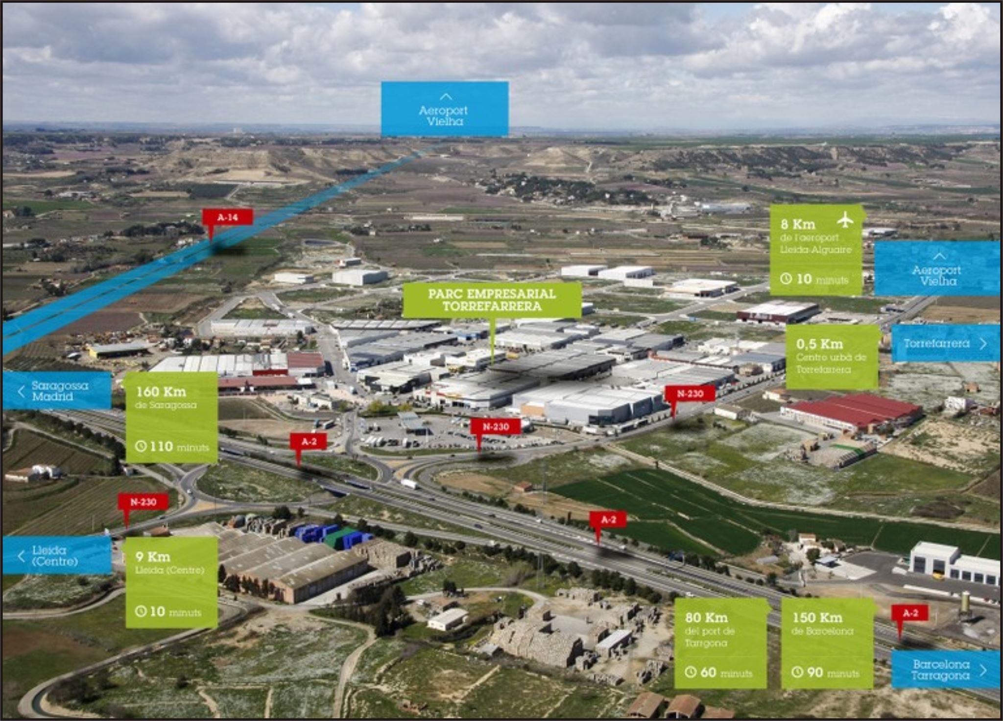 El terme comprén el poble i cap de municipi de Torrefarrera, que centra el sector principal, i el de Malpartit, que centra el segon esmentat, a més de les urbanitzacions de les Comes (dita també les Comes de Felipet), Corxat, el Pla de la Pona, Salats, la Raconada i el Tossal (compartida amb el municipi de Torre-serona). El terme principal és travessat de S a N per la carretera N-230, de Lleida a la Vall d’Aran, i per pistes que van a Alpicat, a Malpartit i a Torre-serona. Cal destacar la proximitat de l’autovia A-2, amb sortida a la N-230 i al límit amb el municipi de Lleida.