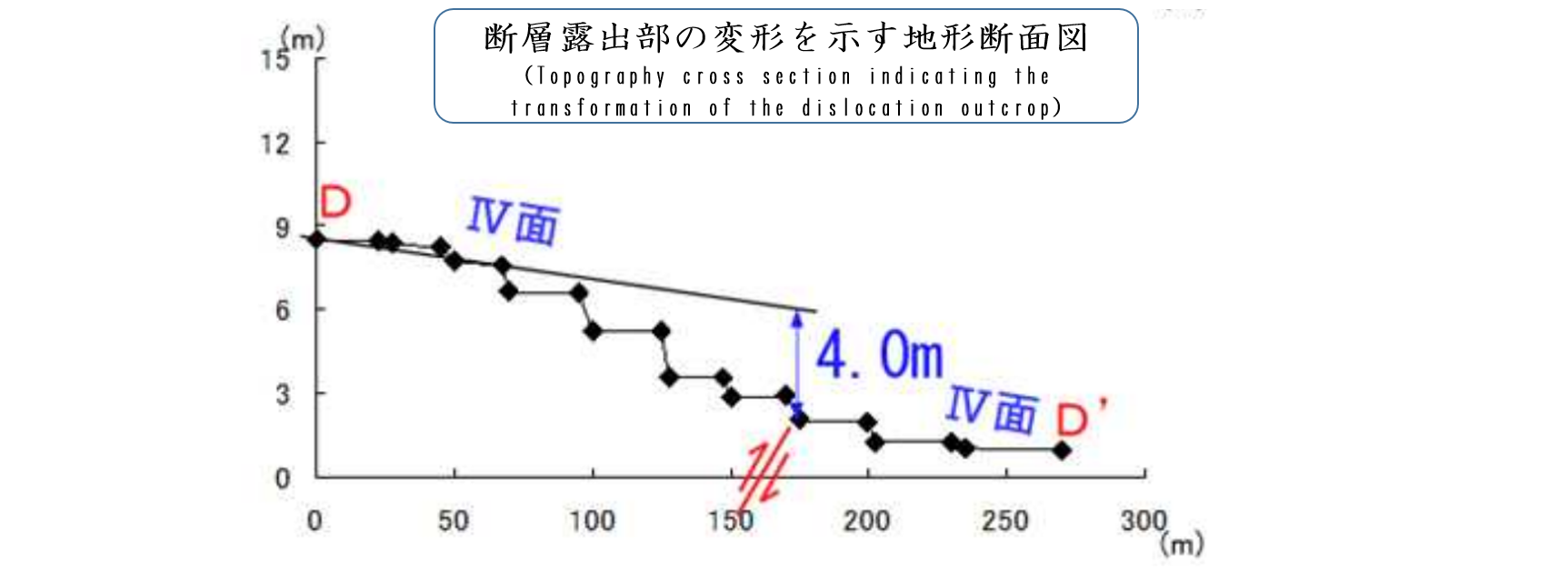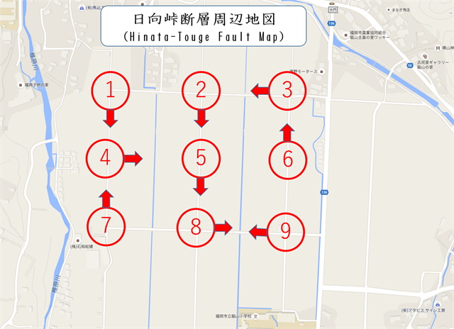 Hinata-Touge fault is "Sinistral Strike-slip faults", but takes "southwestern side upheaval ingredient" partly. And We can confirm the "upheaval" at a public coordinate spot.The population crowd place place that can watch fault near of the downtown area is extremely valuable. (blue frame part of the chart below)