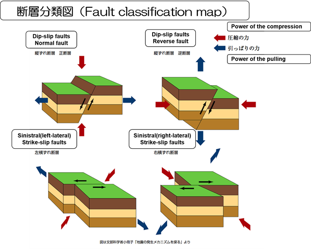 When a fault plane inclines, among the bedrock of both sides, We call "a hanging wall", a deep side "a footwall" in a shallow side. We call time when the block of both sides moves the fault plane in the top and bottom direction as a boundary "Dip-slip faults". Among "Dip-slip faults" We say , a case to push its way up to in the case is "normal fault", other the hanging wall side slips down is "reverse fault". On the other hand, when the block of both sides works horizontally, I call it with "Strike-slip faults" and call a case to move the case that the block of the counterpart moves to the right towards a fault line to "Sinistral (right-rateral) Strike-slip faults", the left "Sinistral (left-rareral) Strike-slip faults". By the inland earthquake of Japan, a lot of "Strike-slip faults" types are existed in the West Japan from the Chubu District, and "reverse fault"types are existed in North Japan of the Tohoku districts. "Dip-slip faults", the thing to be able to call "Strike-slip faults" are rare, and many things are diagonally purely as above when they watch real dislocation.