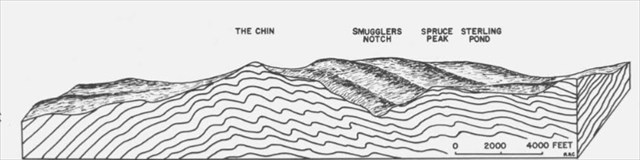 The current Green Mountains is believed to have been formed by the folding and crumpling of schist by a westward movement of large masses or rock. The large complex fold that is the basic structure of the Green Mountains is called an anticlinorium. An anticline is defined as an upward fold where the individual rock layers can be traced through the structure and is similar to that of the arch. The opposite of this is called a syncline, where the layers dip into a trough or basin. The anticlinorium is a large anticline with smaller anticlines and synclines superimposed within it.