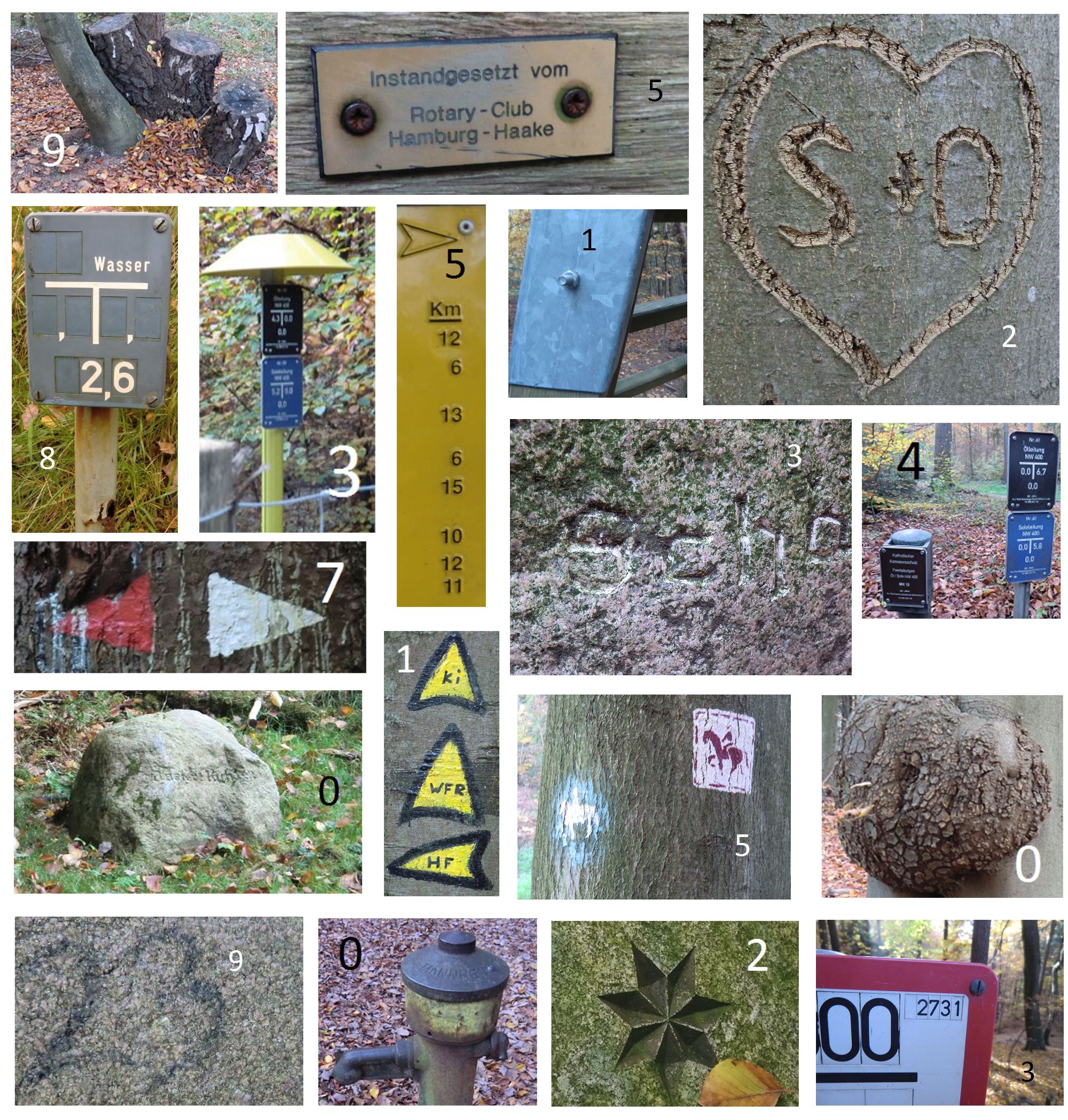Um den Cache entspannt machen zu können empfehlen wir Euch das Listing und / oder die Grafik auszudrucken. Bei Eurer Wanderung kommt in an den im Listing aufgeführten Wegpunkten A bis O vorbei. Zu jedem dieser Wegpunkte passt genau ein Bild. Dazu müsst Ihr Euch ein wenig umschauen und das Objekt / den Bildausschnitt suchen. Jedes Bild hat eine Ziffer, sodass Ihr am Ende eine eindeutige Zuordnung von Wegpunktbuchstabe zu Zifferbild habt.