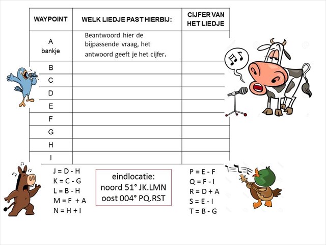 - Nu ga je rondlopen en kijken op de hele kinderboerderij. Als je weet welk liedje bij welke plek hoort schrijf je het getal van dat liedje op bij de letter van het waypoint. Misschien ken je niet alle liedjes maar dan wil mama of oma die vast wel voor je zingen.