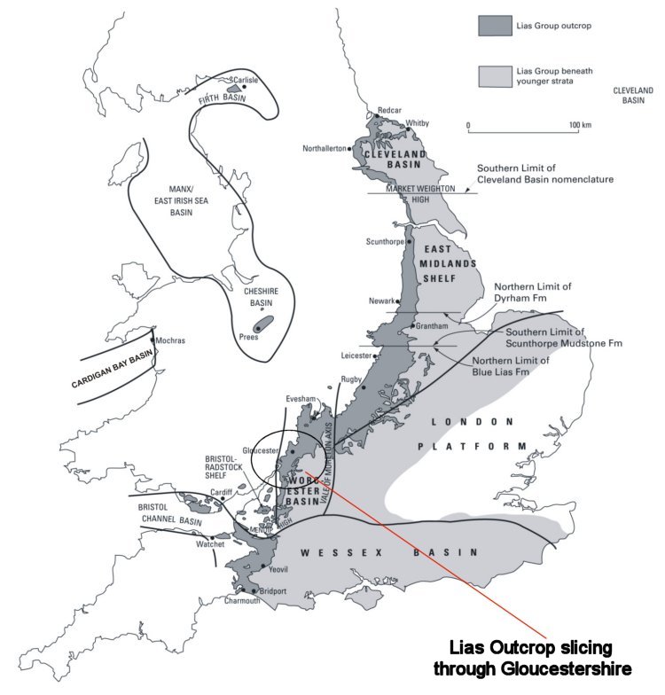 It comprises those predominantly clay-rich sediments of latest Triassic and Early Jurassic age found in and around the United Kingdom, deposited between 180 and 205 million years ago; extending in a continuous band from the coast of Dorset through to Yorkshire, with outlying areas in Somerset and South Wales.